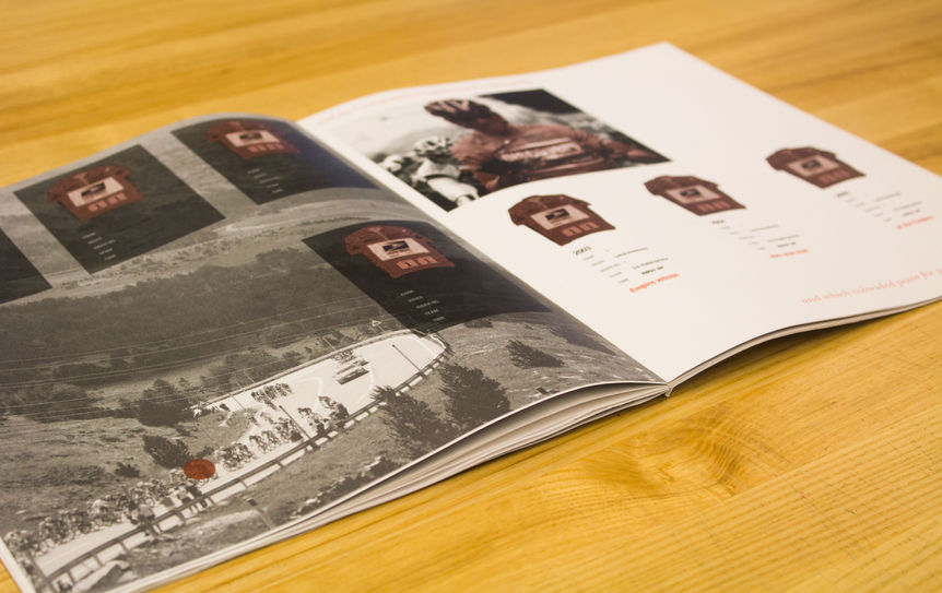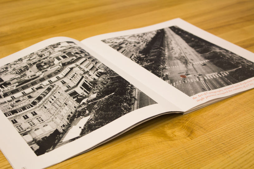 The catalog opens with a Tour de France race map and race statistics. This serves as a parallel realm for Borges's "Empire". The second spread is an image of cyclists entering Paris or Borges's "City". In the third spread I used Armstrong's tour statistics to symbolize Armstrong's rise, much like the rise in the excerpt. Armstrong won seven consecutive tours from 1999 to 2005. The fourth spread, inspired by the 1999 Trek bike catalog, details Armstrong's Trek bikes. These are Armstrong's "maps," as referenced in Borge's text. The fifth spread pays homage to Armstrong's race jerseys from his seven tours. Armstrong's jersey number rose from181 in 1999 to number one by 2005. In the sixth spread, I pulled imagery from 2013 headlines where Armstrong admits doping. I paired this with the final text from the excerpt to represent the fall in Borge's "Empire".
